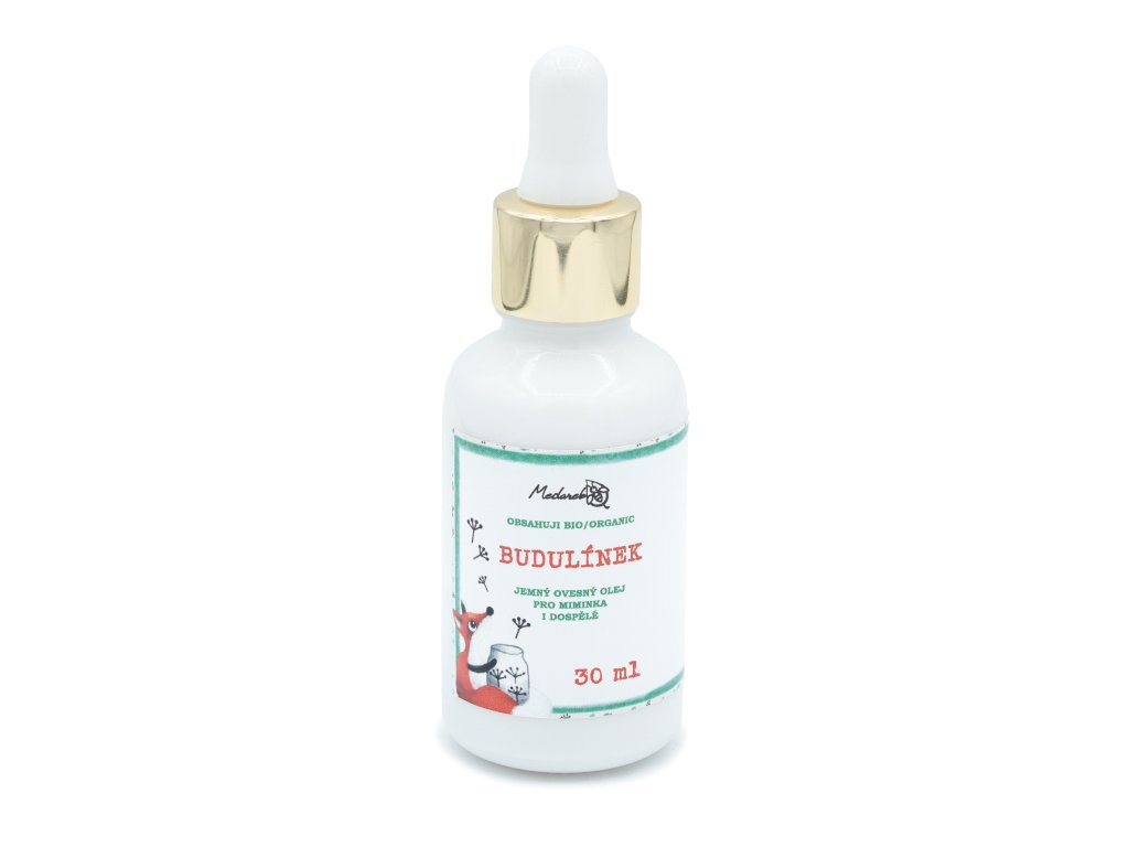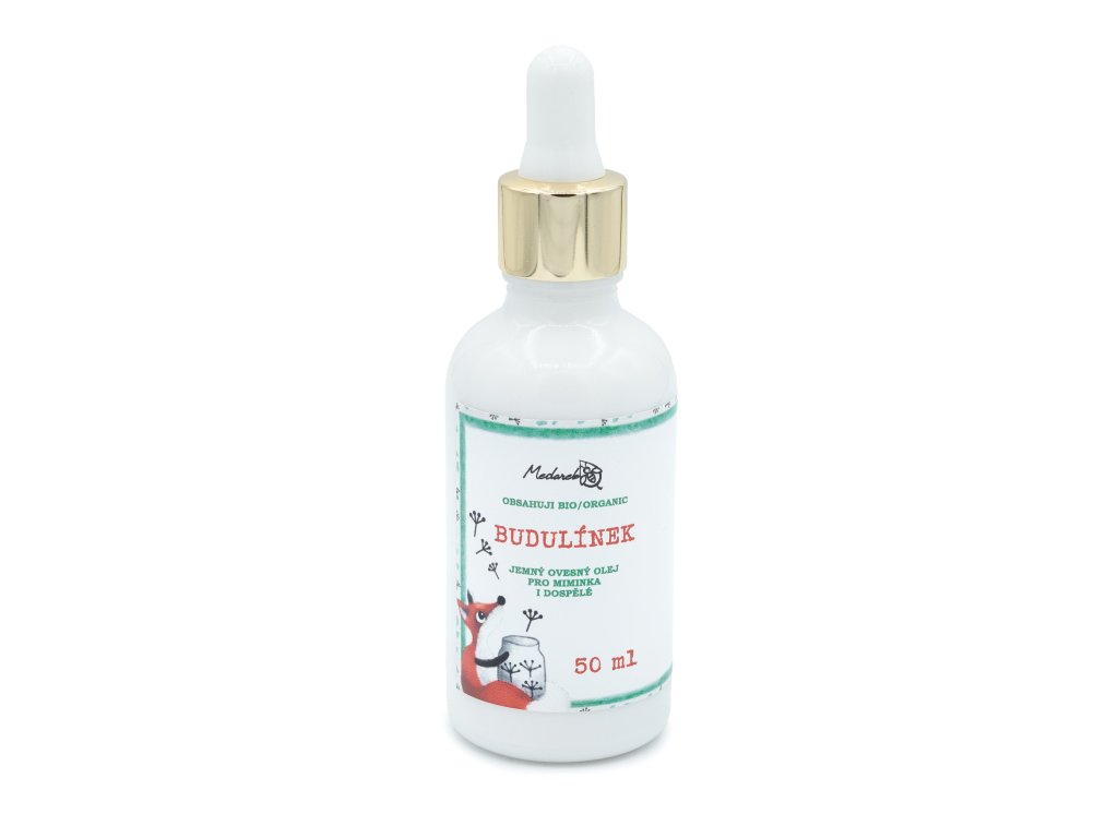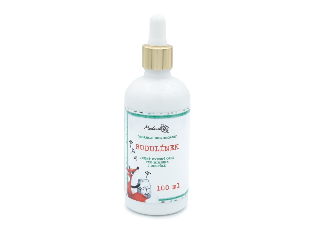 Základ tvoří bio jojobový za studena lisovaný olej (správně tekutý vosk), který znáte z naší unikátní Zinkové masti. Jojobový olej zvyšuje odolnost kůže a má úžasné regenerační účinky. Rýžový olej v bio kvalitě napomáhá tvorbě kolagenu, snižuje opotřebení pleti, pomáhá ji udržet v kondici. Ovesný olej je unikátní při péči o poškozenou kůži. Jde o velmi ceněný a těžko dostupný olej. Budulínek je dále obohacen o bio extrakt z ovsa, který je vysoce koncentrovanou silou této úžasné obiloviny. Bio meruňkový olej přináší kůži další benefity v podobě přírodního vitamínu E i zvýšení elasticity kůže. Je olejem číslo jedna pro dětskou a citlivou kůži. Trocha vanilkového extraktu vytváří spolu s ovsem jemnou vůni snídaňového müsli :).