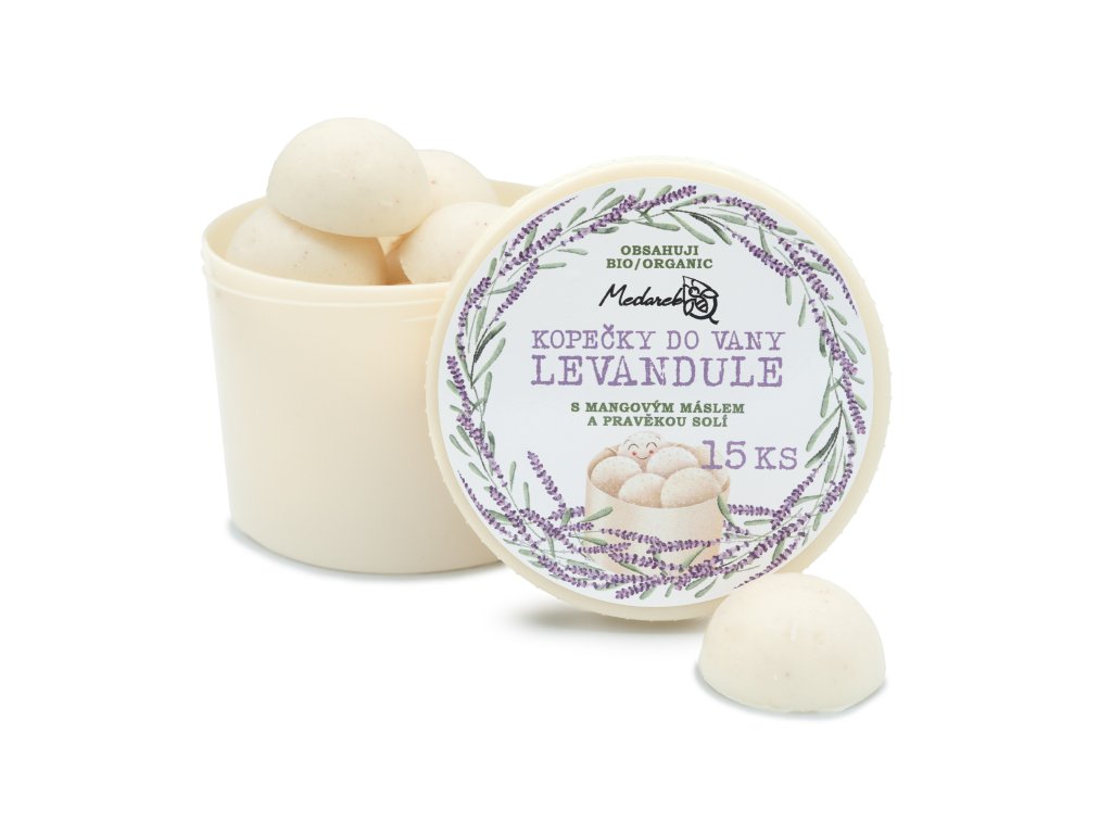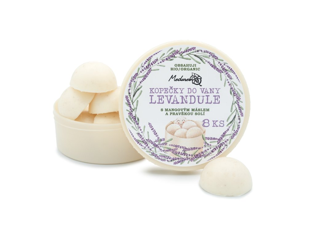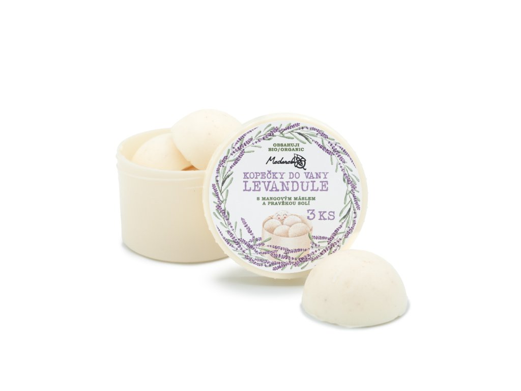 Pečující kopečky do vany s levandulovým esenciálním olejem a pravěkou solí.